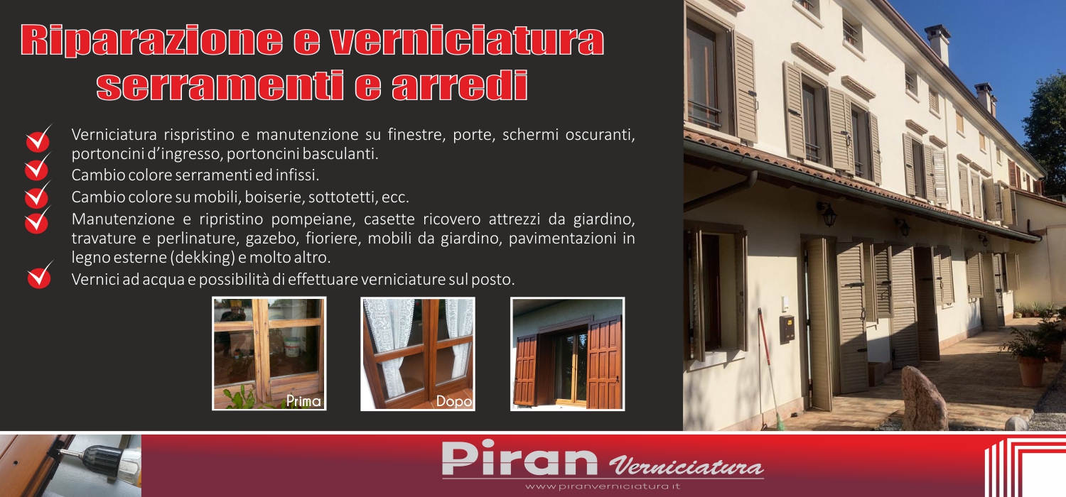 Piran Verniciatura garantisce una pluriennale esperienza nel restauro e recupero con nuova verniciatura di serramenti e arredi in legno, dai portoncini d’ingresso, alle finestre e porte interne fino ad arrivare al restauro dei balconi in legno. L’esperienza del nostro staff permette di recuperare al meglio i vostri attuali serramenti riqualificandoli con la possibilità di sostituzione dei vetri con doppi vetri e con l’inserimento o la sostituzione delle guarnizioni per migliorare la tenuta stessa del serramento. Ci occupiamo inoltre anche della riqualificazione e verniciatura di arredi in legno con tipologie di verniciature e colorazioni a vostra scelta. Da quest’anno inoltre facciamo un servizio di fornitura e posa di zanzariere in alluminio su misura e sostituzione e riparazione di avvolgibili. Richiedeteci un preventivo o un sopralluogo per verificare la migliore soluzione per recuperare i vostri serramenti o i vostri arredi.